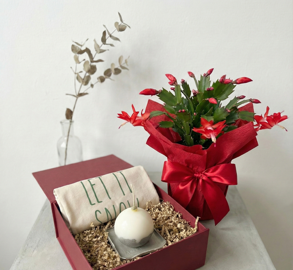 Un set cadou de Crăciun elegant și cald, perfect pentru a aduce natură, lumină și un strop de răsfăț în casa celor dragi. Pachetul combină o Crăciunică înflorită, o lumânare artizanală Aruma și un tricou...
