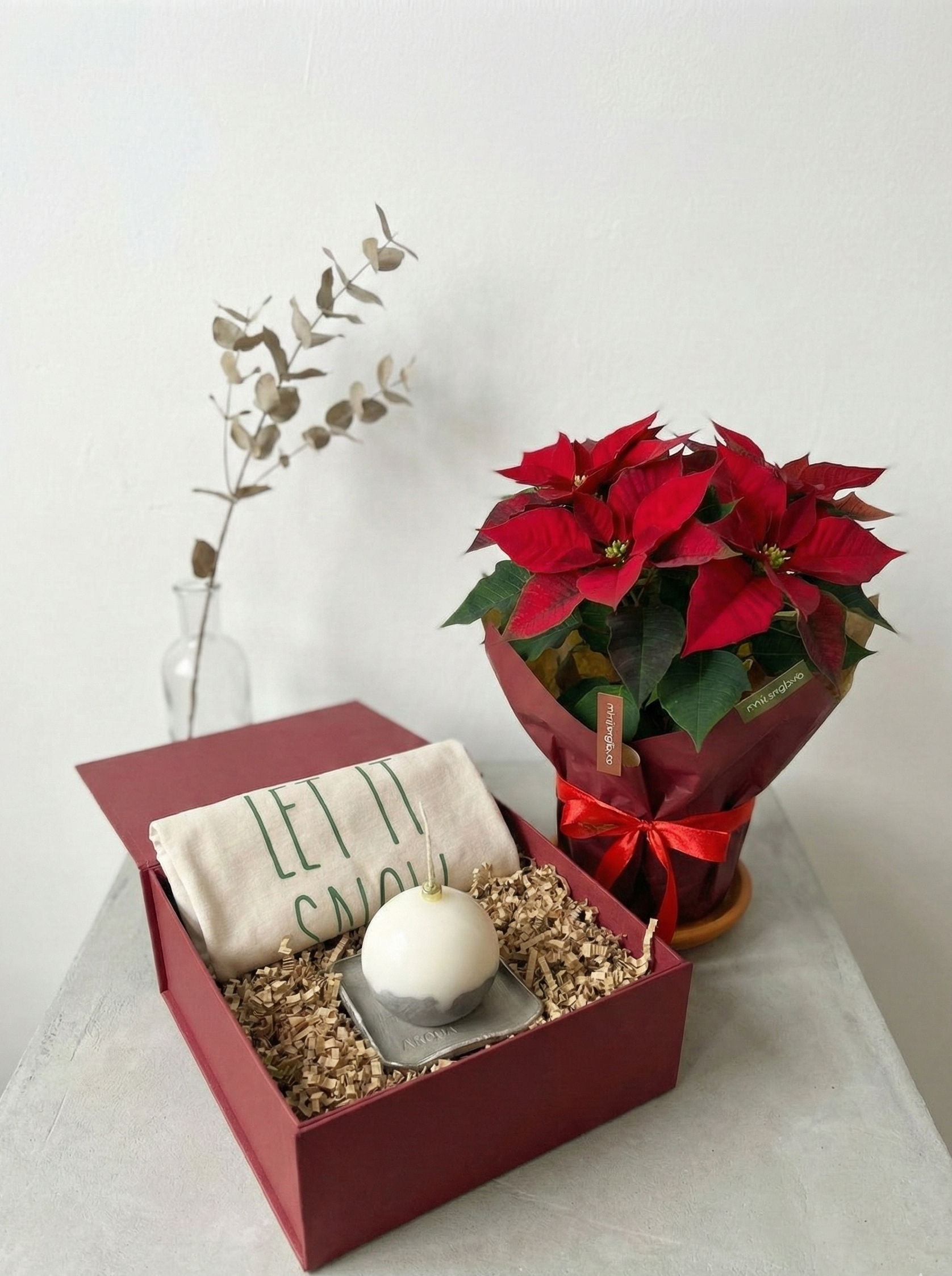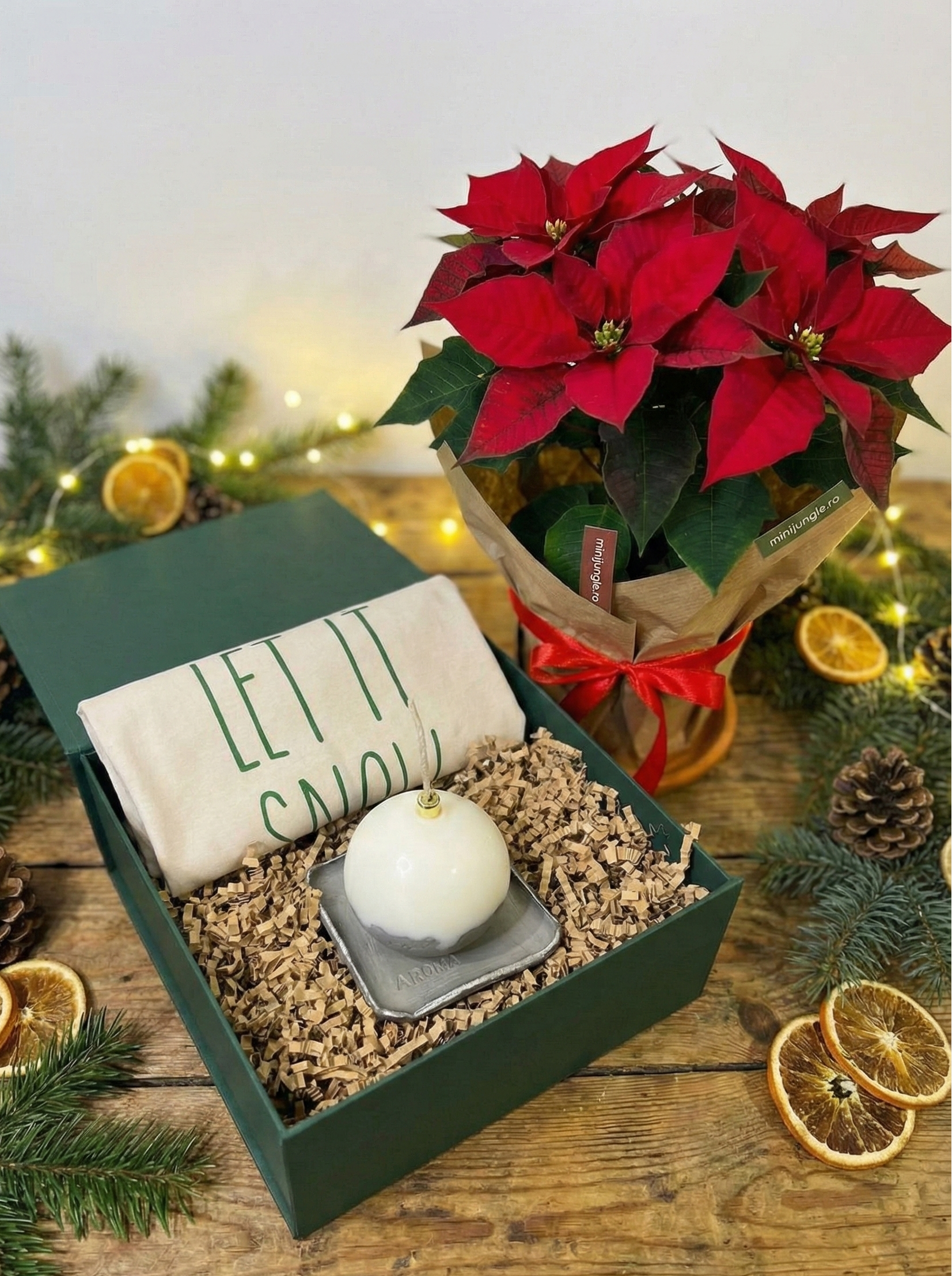 Un set festiv, elegant și atent compus, care combină plante naturale, produse artizanale și o piesă vestimentară premium. Perfect pentru a aduce spiritul sărbătorilor în orice spațiu.