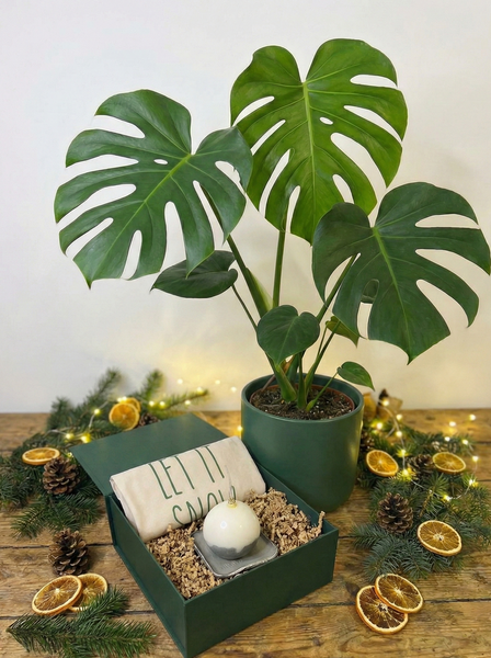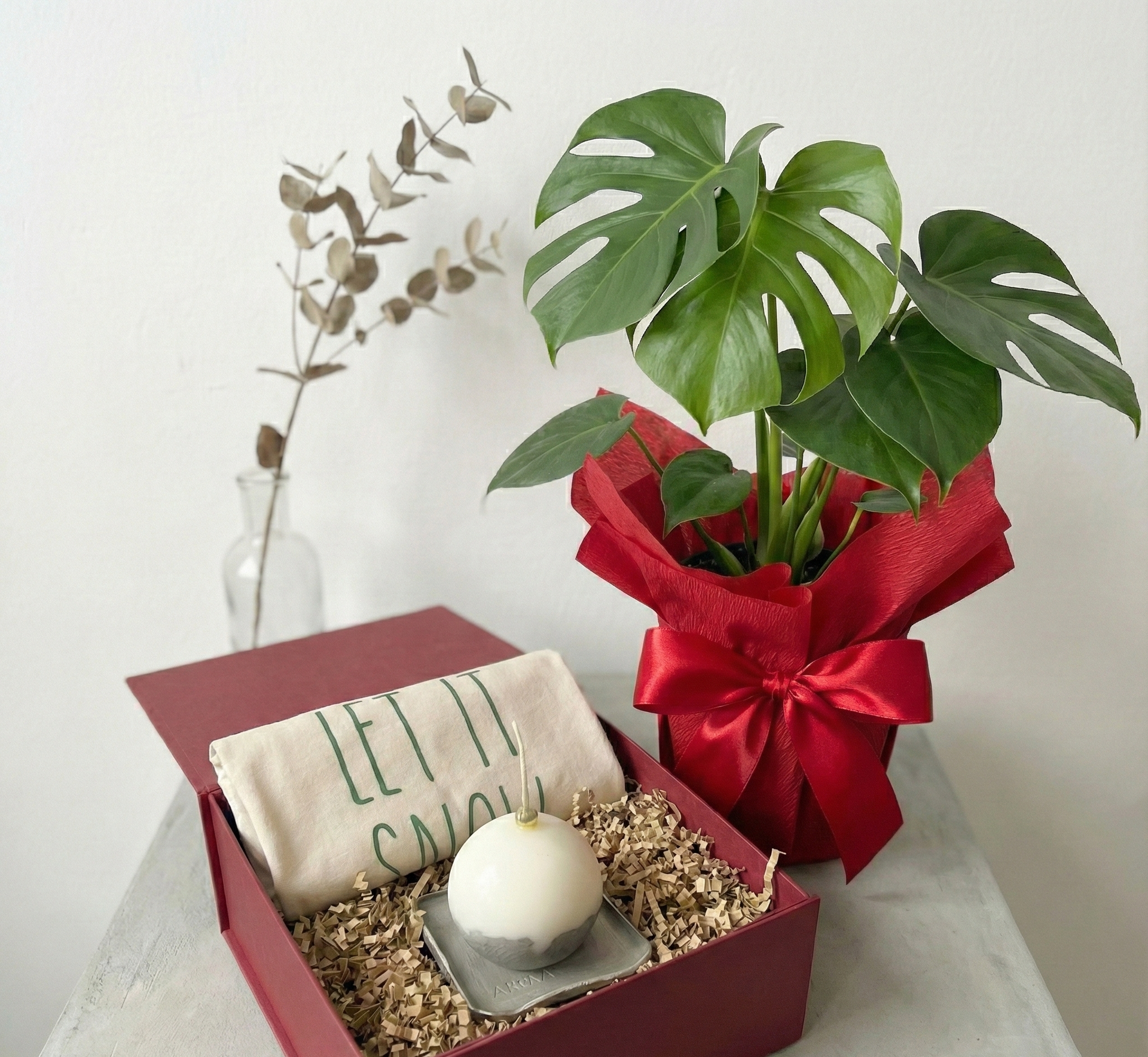 Un cadou statement pentru cine iubește designul curat și plantele cu personalitate. Monstera Deliciosa aduce instant vibe-ul „green home”, iar lumânarea artizanală și tricoul complet vin într-o cutie premium gata de oferit.