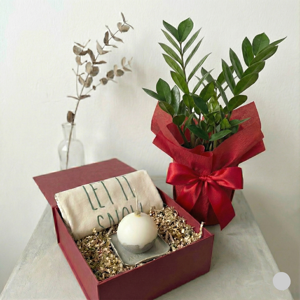 Un cadou modern și super ușor de întreținut, perfect pentru birou, acasă sau pentru cineva care iubește plantele dar nu are timp să le „babysit-uiască”. Zamioculcas, lumânarea Aruma și tricoul oversize formează un set elegant și cool, potrivit sezonului.